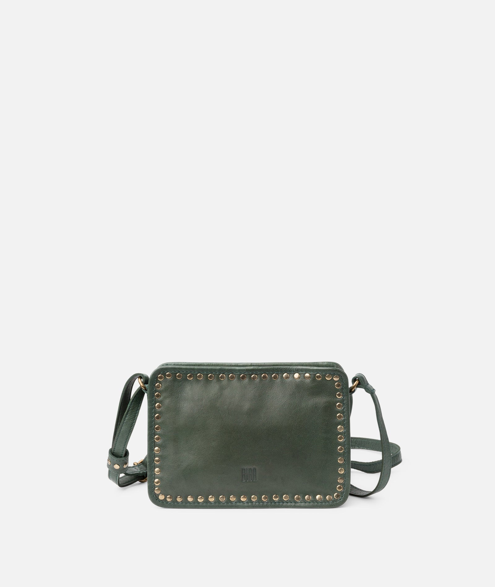 Washed cowhide shoulder bag. Two compartments with zipper closure. Adjustable shoulder strap. Multiple external and internal pockets. Cotton lining.