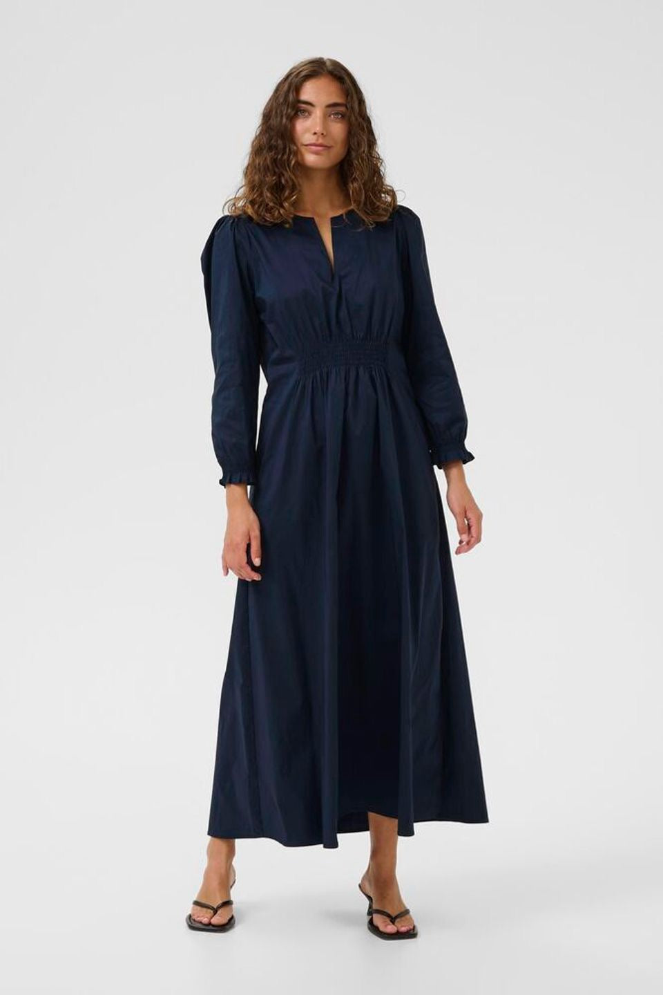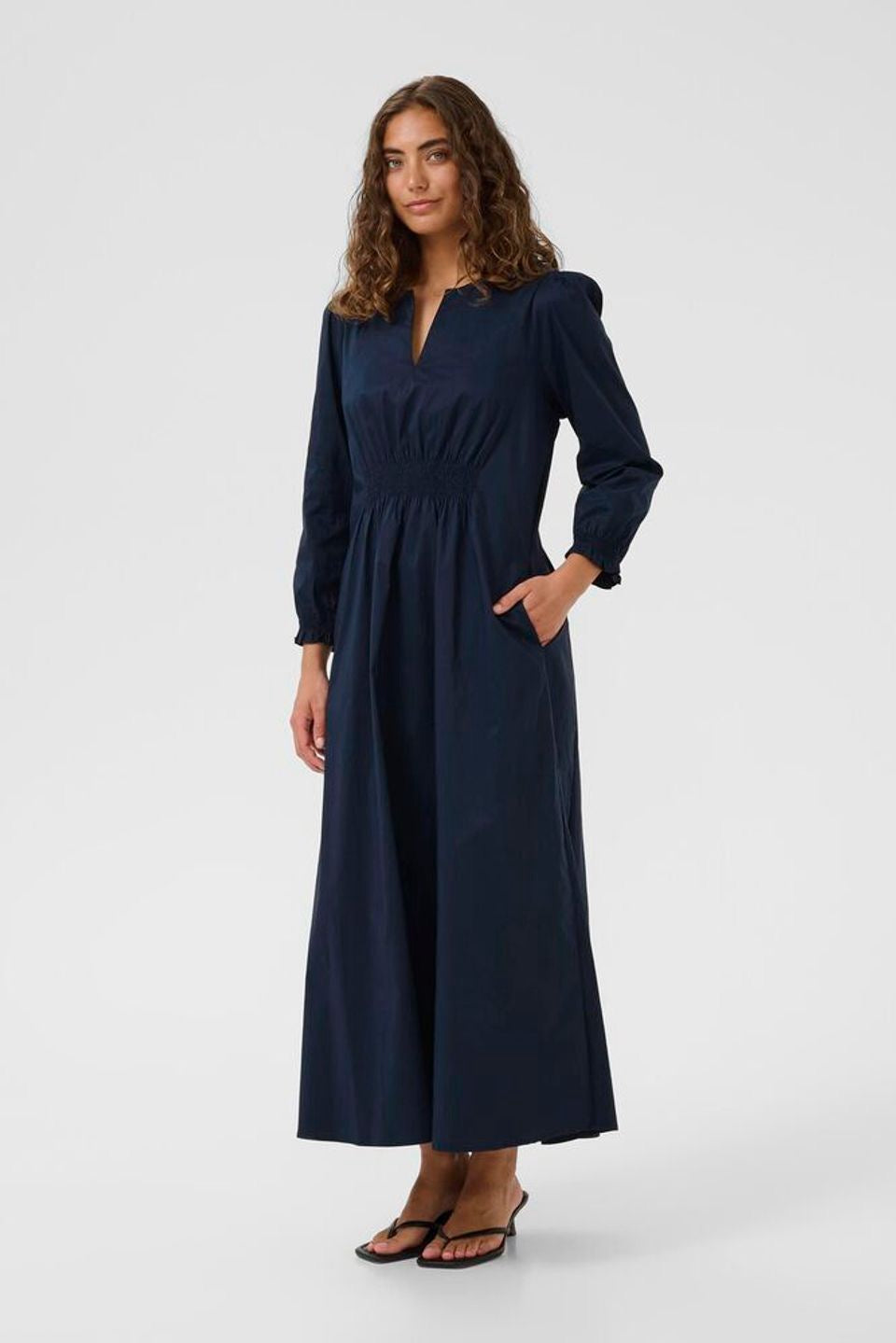 Midi dress with relaxed fit features a flattering smocked waist, round V-neckline, and three-quarter sleeves. Its flowing silhouette and comfortable cotton-touch fabric ensure effortless style for various occasions.