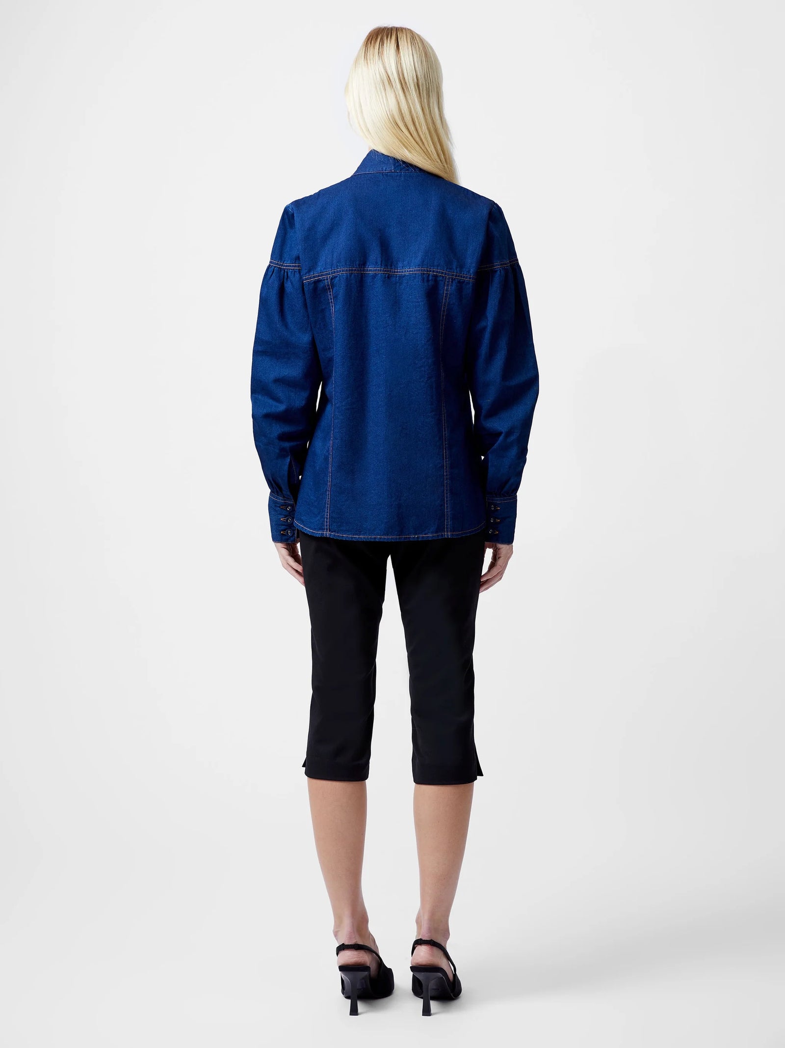 This lightweight chambray shirt pairs its long sleeved silhouette with a concealed button-through fastening, self-tie neckline and on-trend contrasting top stitching.