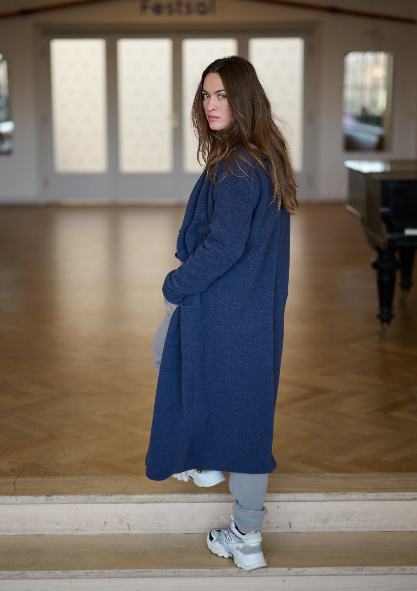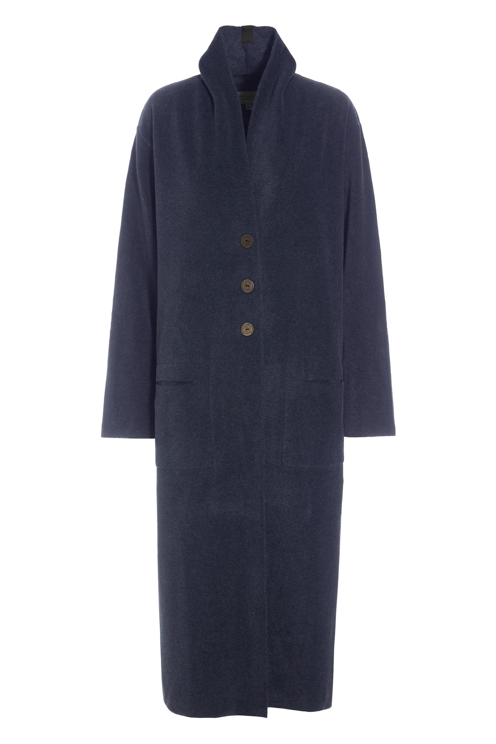 Long cardigan with large collar, pockets, and three brass buttons down the front.