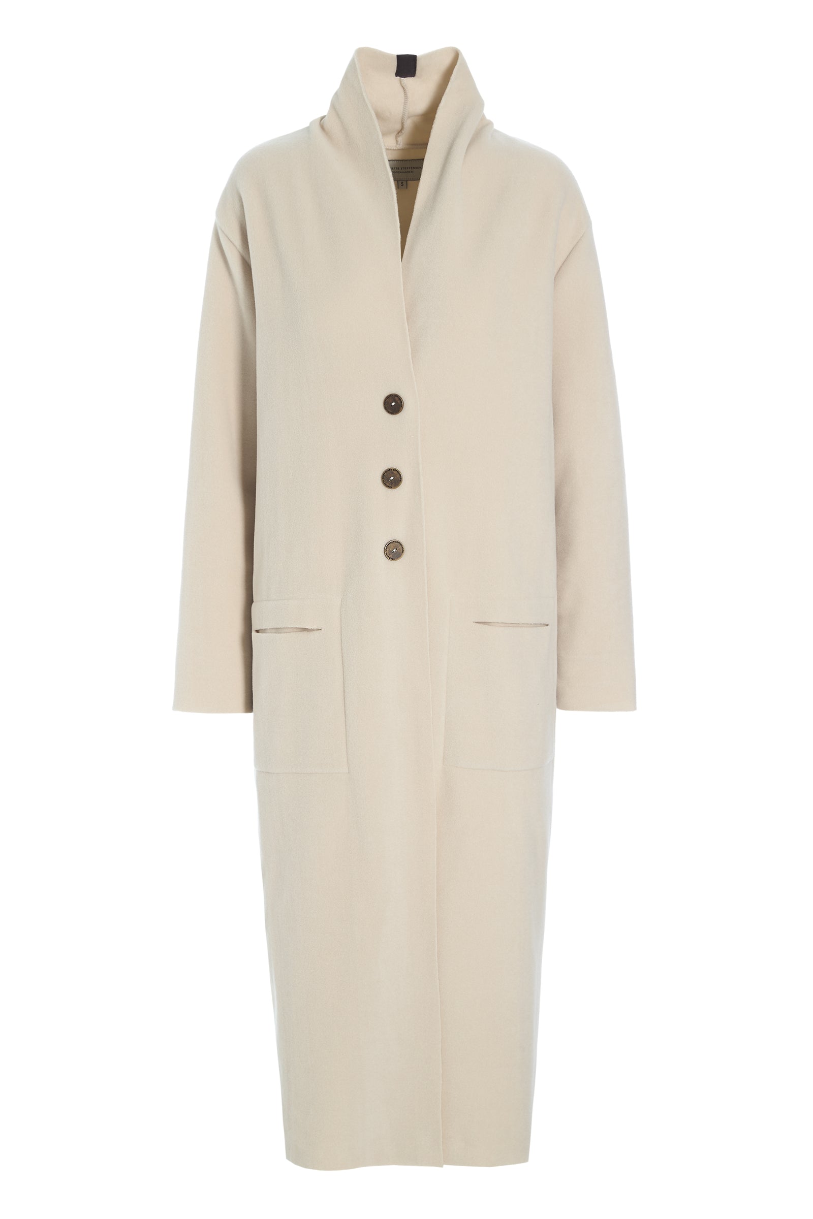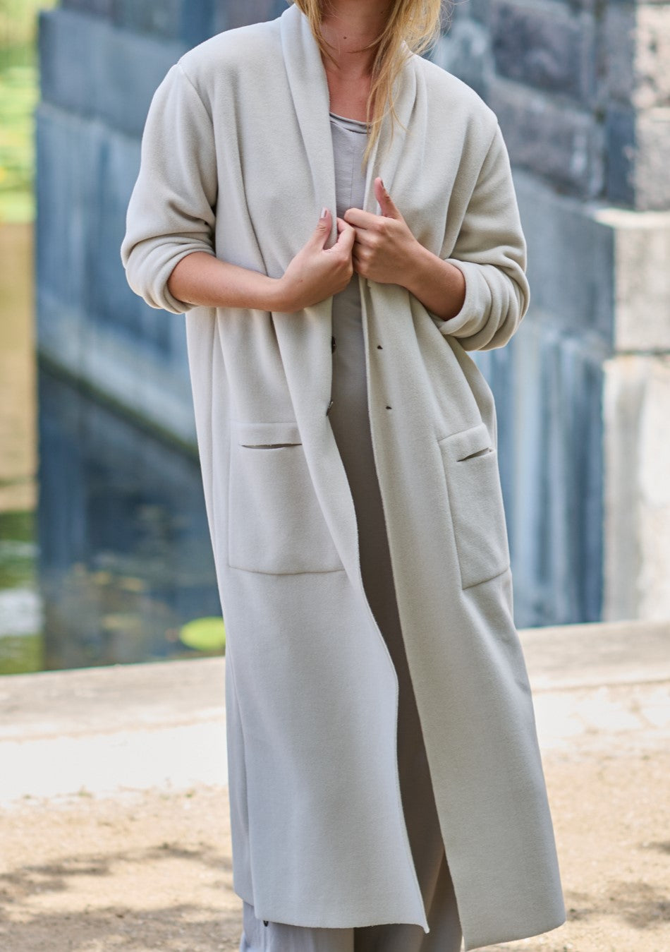 Long cardigan with large collar, pockets, and three brass buttons down the front.
