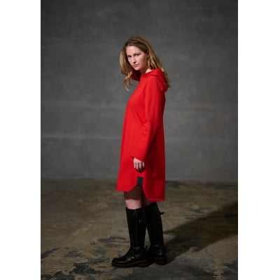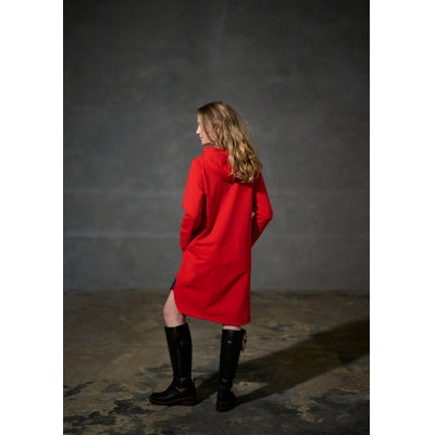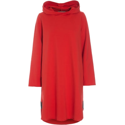 A soft sweat dress in organic cotton with long sleeves, a hood, and a slightly longer back for a relaxed, modern look.