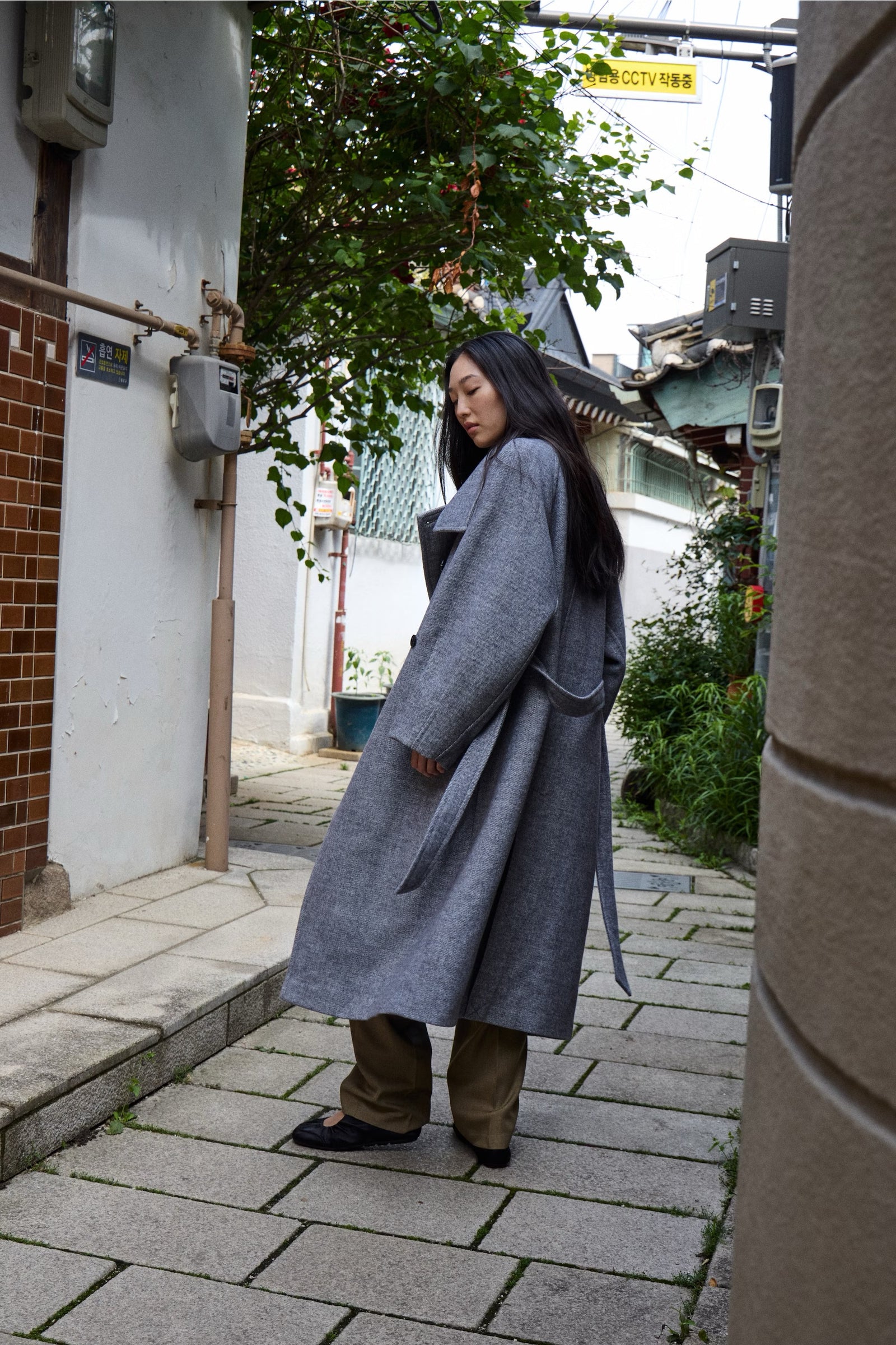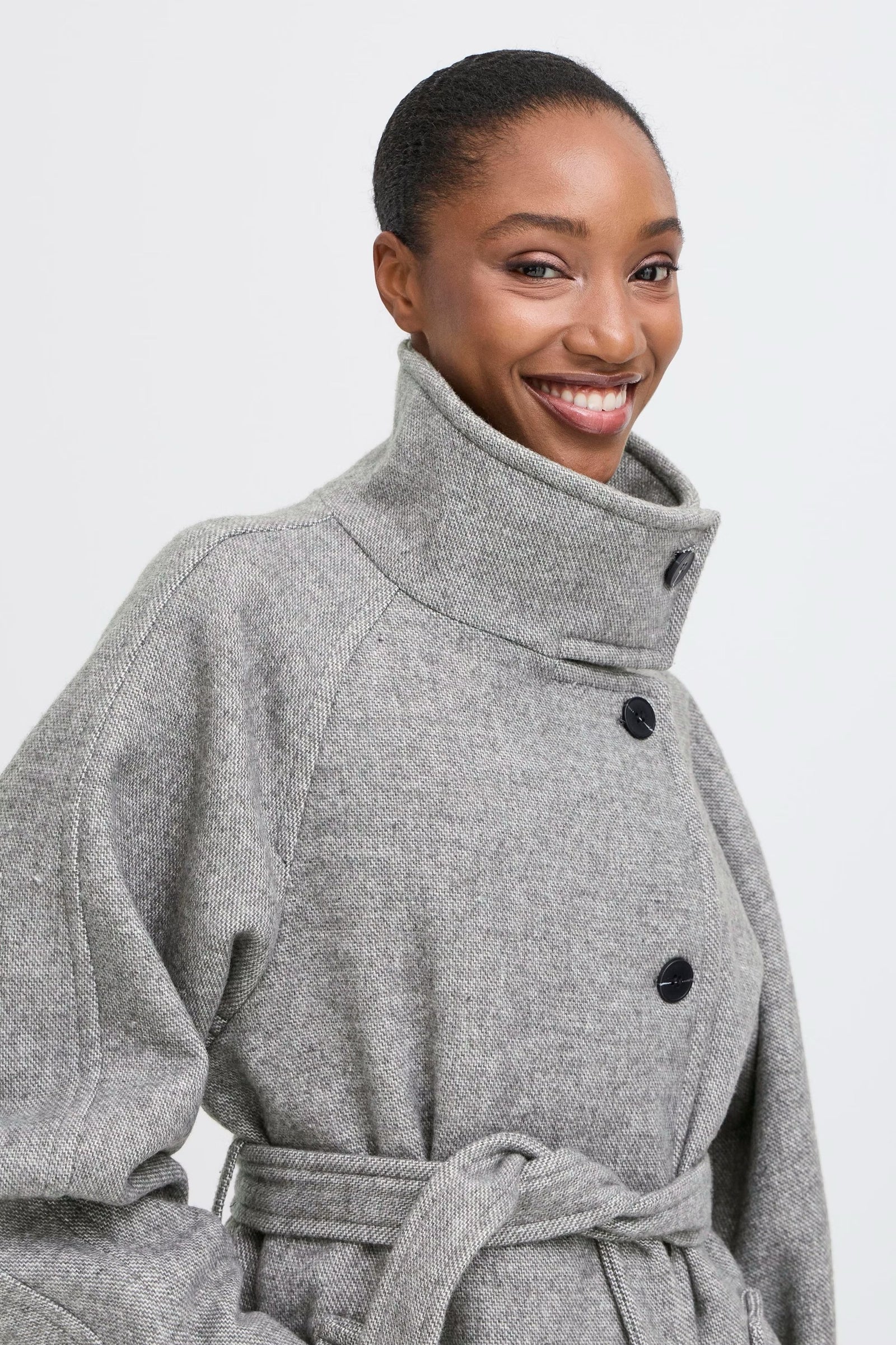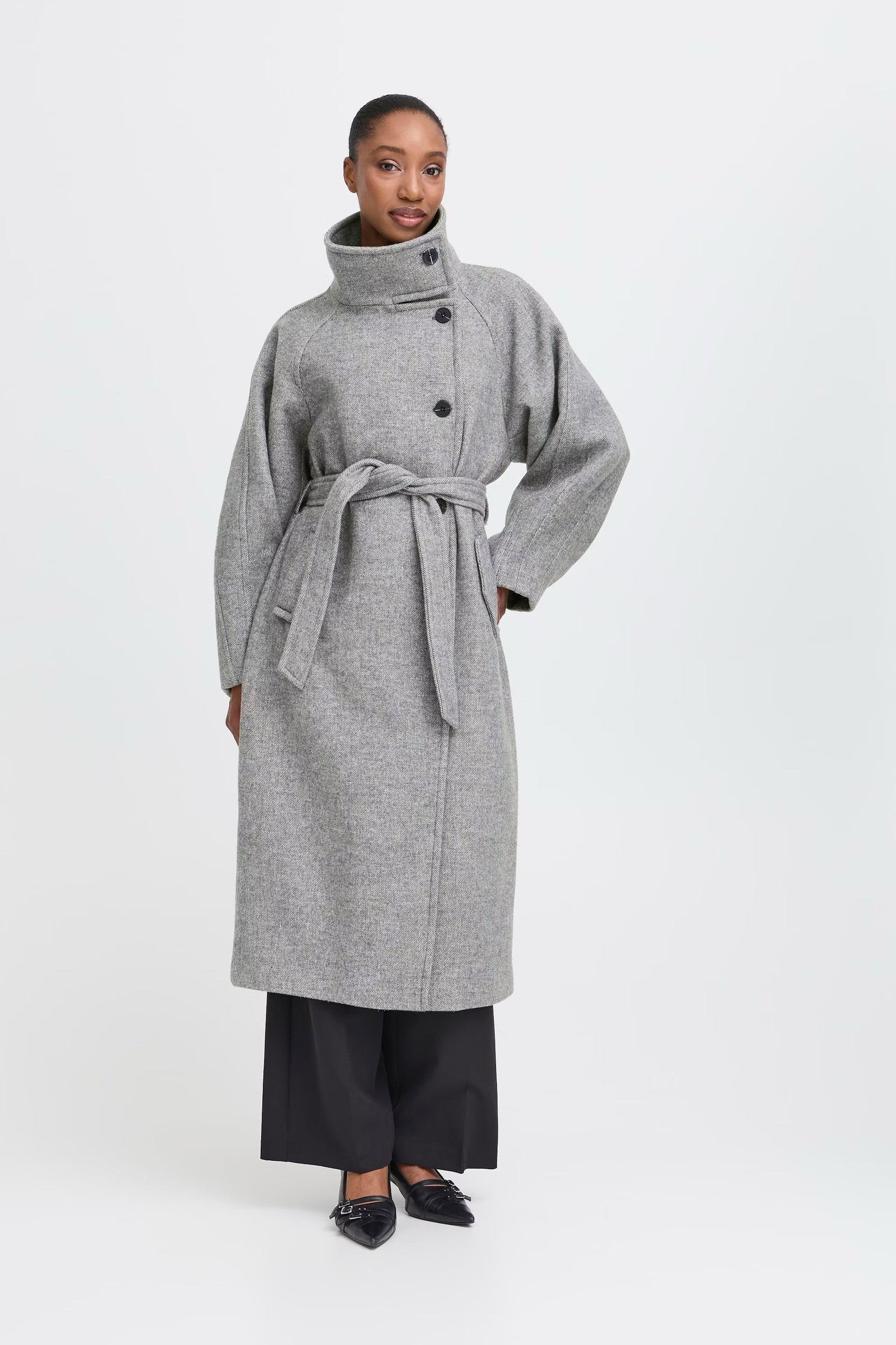 Long belted coat for women designed with a relaxed fit, high neckline, wide lapels, and buttoned closure. Comfortable silhouette, ideal for versatile wear in formal or casual settings.