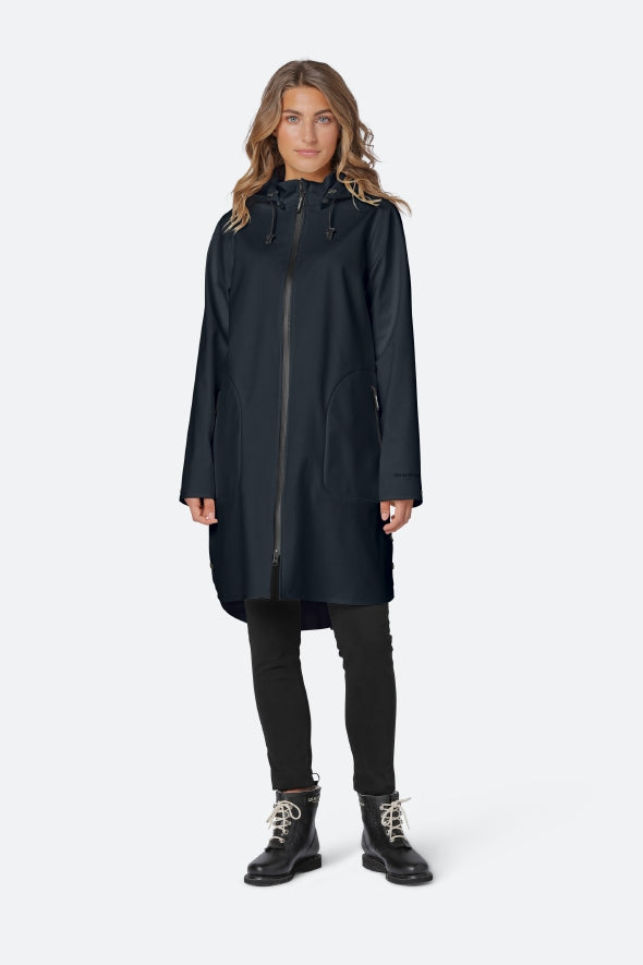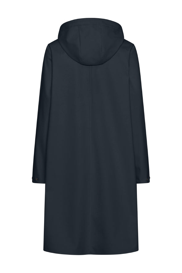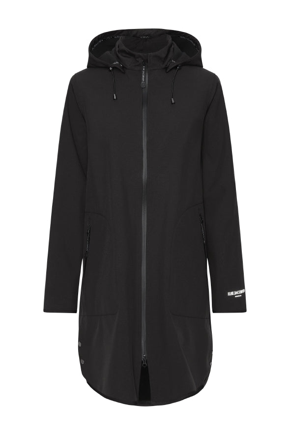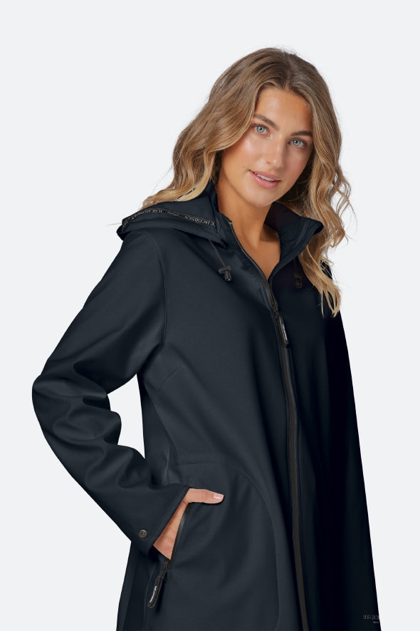A feminine and functional raincoat in a flattering and comfortable a-shaped silhouette. Style is made of breathable soft shell material and body length is just below the knee. The style features a detachable hood, slits in side seams with press buttons, button closure at arm wrist, Ilse Jacobsen Hornbæk reflective logo on left sleeve and a YKK 2-way aqua guard zipper along center front and at pockets. This functional material resists water pressure up to 5000 mm. On top of the fabric we added an Ecorepel water and dirt repellent coating to ensure your garment a long life. All seams are taped. Composition: Shell 94% Polyester, 6% Elastane. Bonding 100% Polyester fleece. Functionality: W/P 5000 mm, M/P 3000 g/m2.