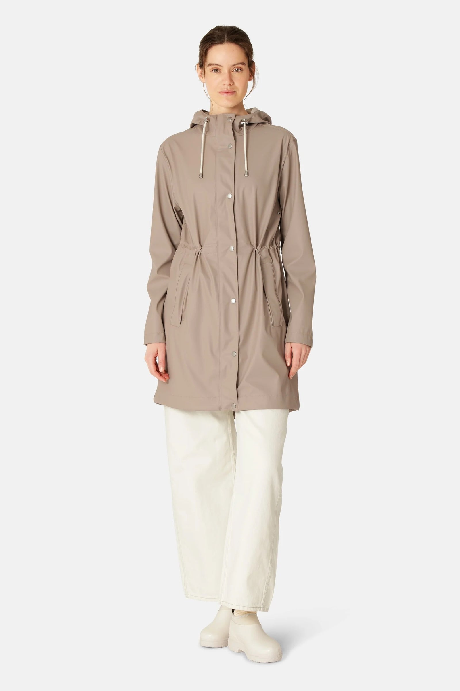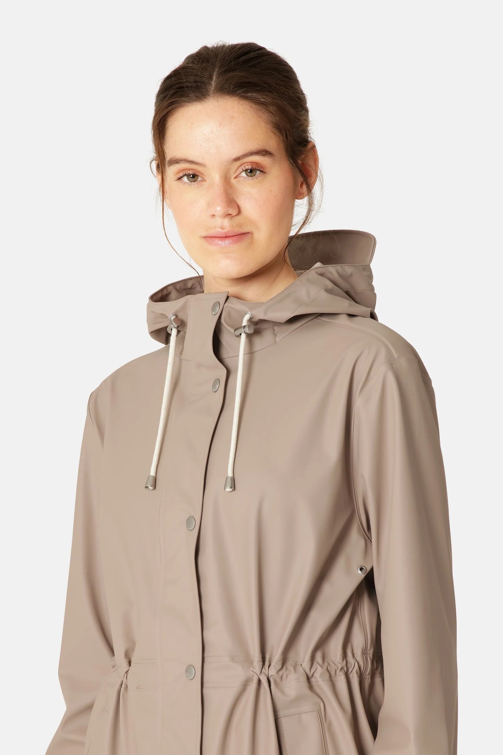 This lightweight, waterproof parka is crafted from durable rubberized PU-coated fabric with a soft tricot backing. Engineered for complete rain protection, it features welded seams and a 5,000 mm waterproof rating. The adjustable drawstring hood with a small cap shields against heavy rain, while underarm eyelets enhance breathability. Slanted front pockets provide practical storage, and the inner waist drawstring, combined with a fishtail hem, creates a flattering fit with unrestricted movement. A versatile essential for staying dry in style.