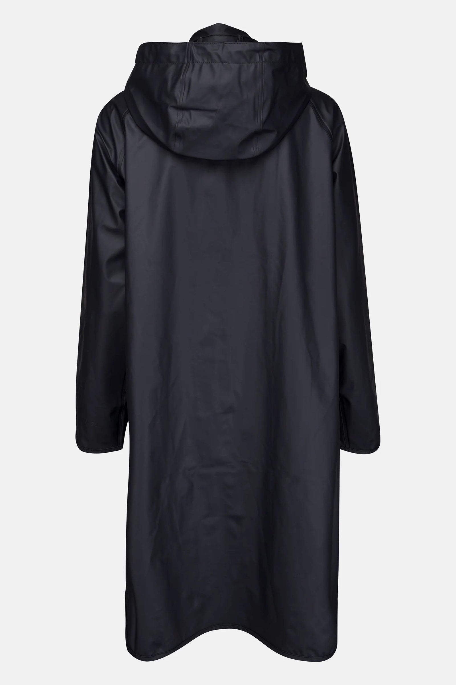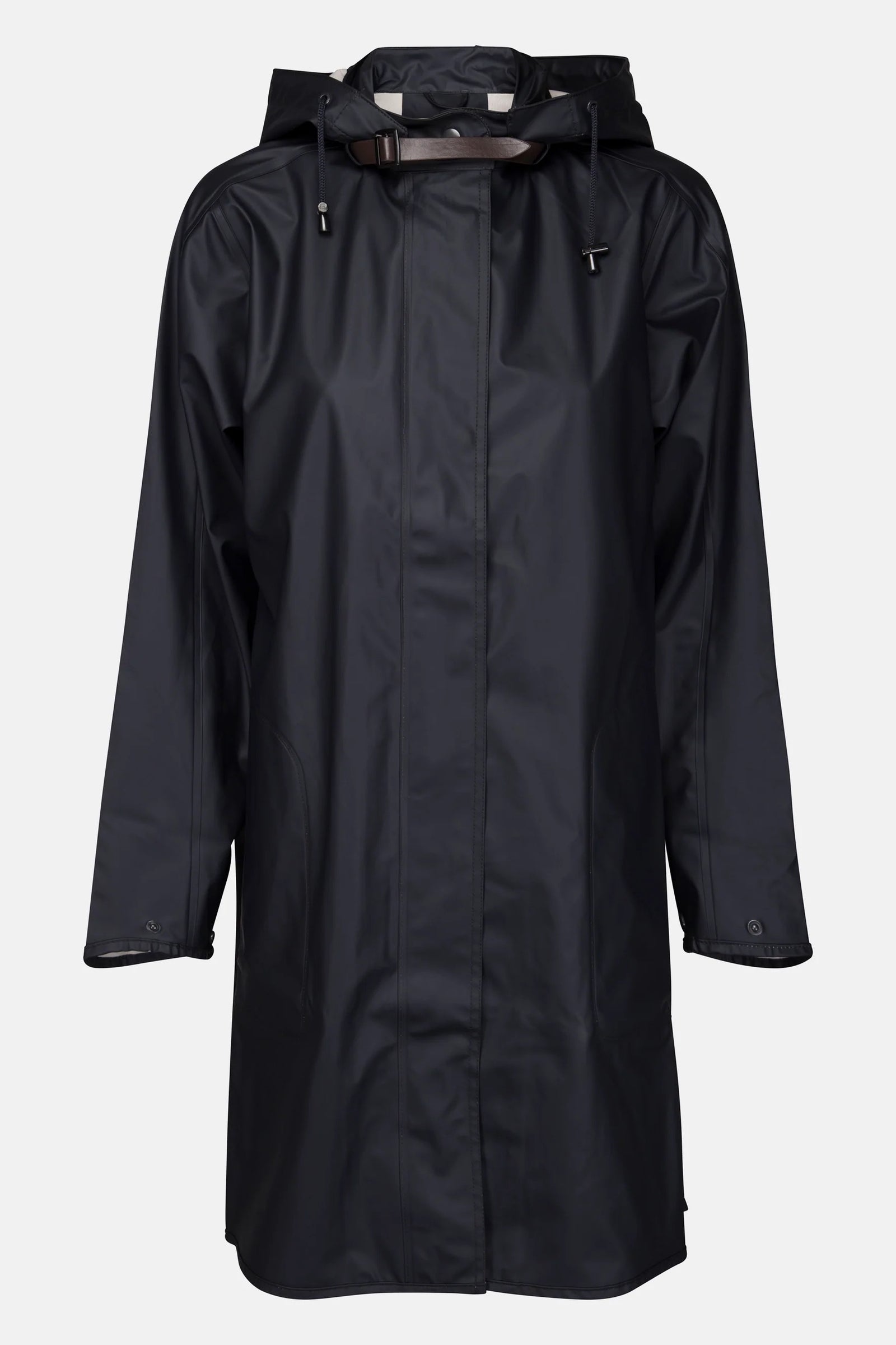 Feminine A-shaped raincoat made in a light and subtle waterproof rubberized PU fabric with a tricot backside. Features include welded seams, a detachable hood with artificial leather strap, side seam slits and storm front YKK 2-way zip closure. The raincoat has a discreet IJH logo debossed on left sleeve. A waterproof rating of 5000 mm will be enough for heavy showers.