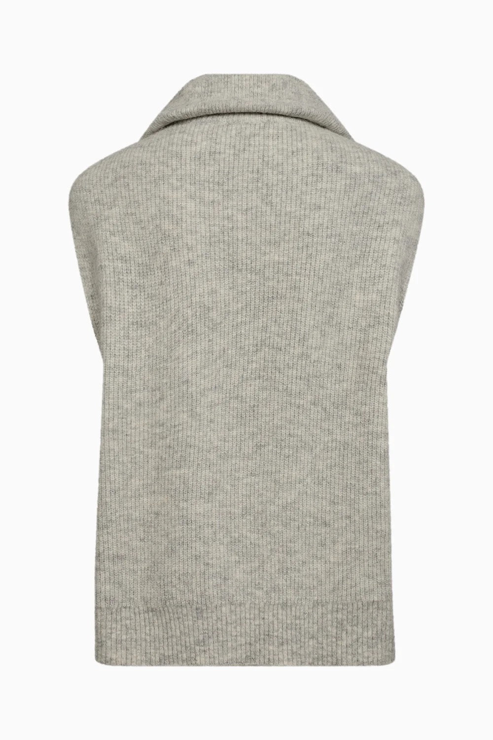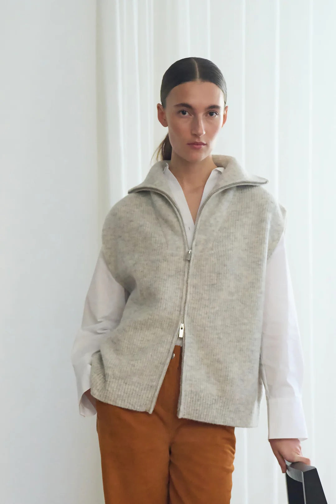 Meet Zally — a modern layering piece crafted in a wool blend for a soft, slightly brushed finish. The sleeveless silhouette is detailed with a two-way zip and tall ribbed collar, giving it a clean yet casual look that pairs effortlessly over shirts or knits.