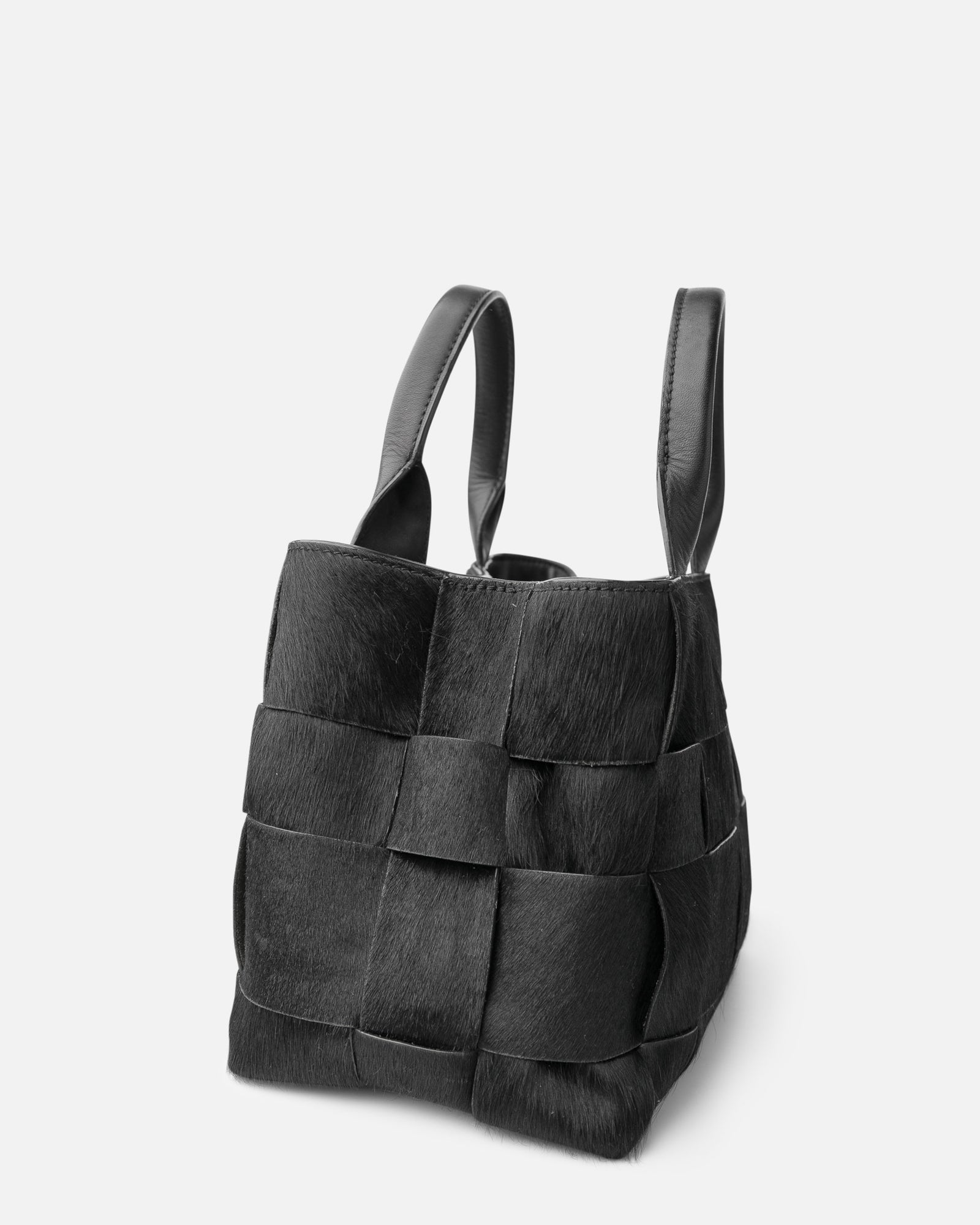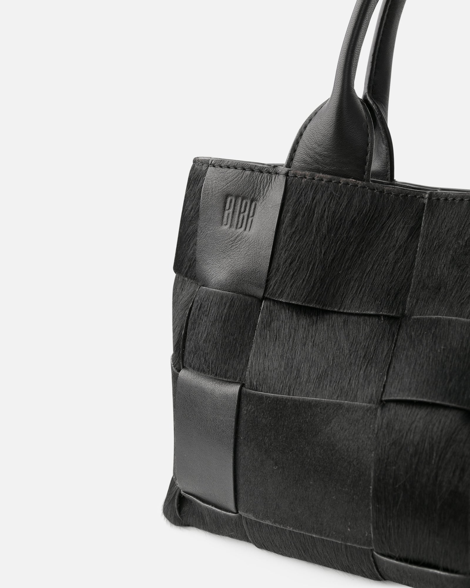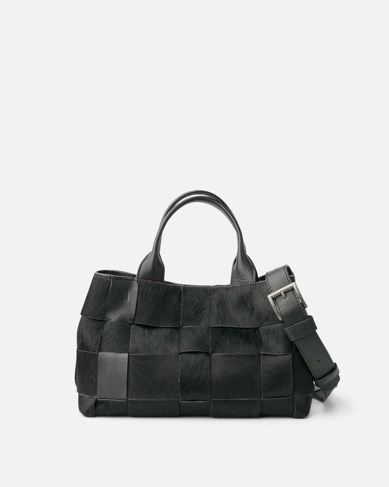 Bowling bag made of cowhide strips, braided on both sides. Hand straps. Adjustable and removable shoulder strap. Button closure. Two internal compartments. Multiple internal pockets. Cotton lining.