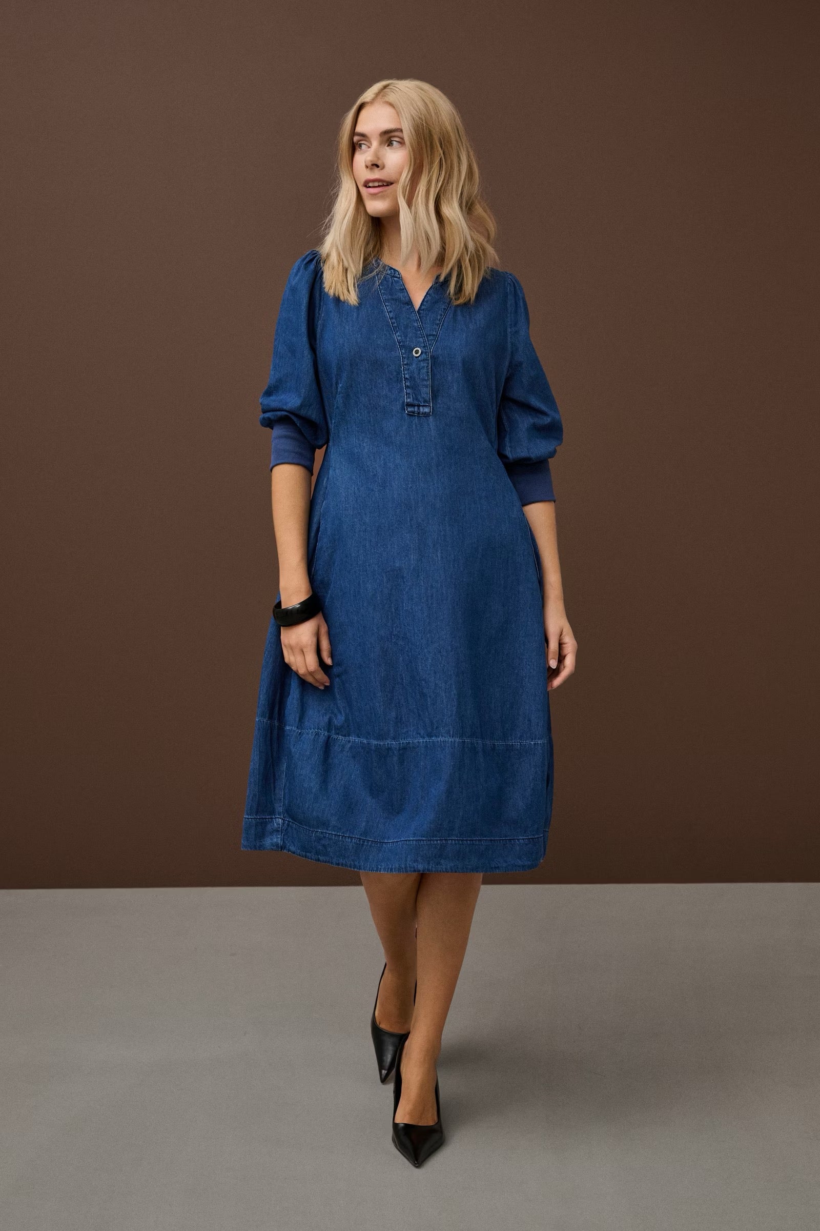 Denim dress features a straight, gently flared silhouette with a split V-neckline, partial button placket, and three-quarter sleeves with cuffed hems. Visible seams add subtle structure and detail throughout the look.
