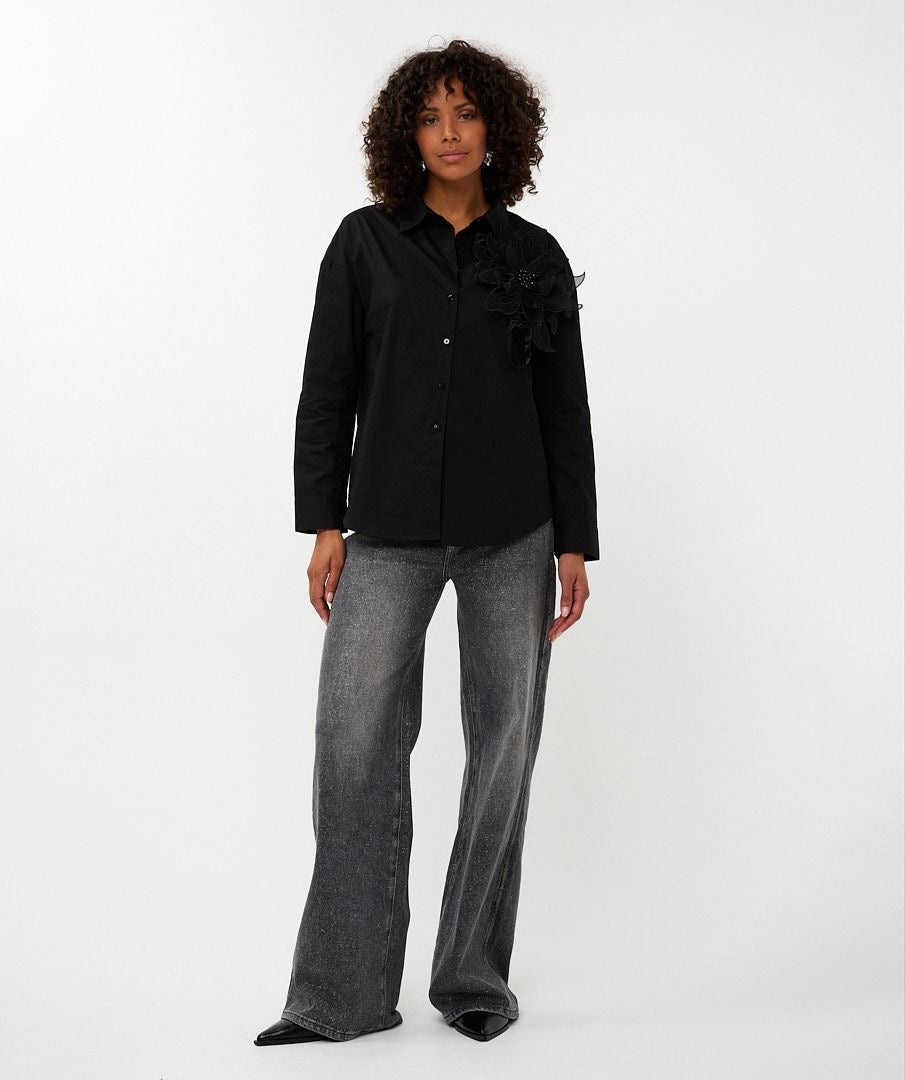 Elegant blouse with large flower on the left shoulder made from 100% cotton. Love this cool style of blouse, team it up with your favourite denims or trousers.