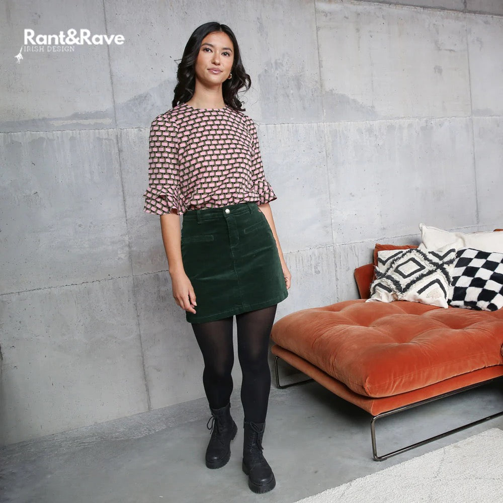 This top is designed in a silky lightweight fabric with a striking geometric print in soft pink and black tones.The relaxed fit and round neckline keep it effortlessly chic, while the ¾ length sleeves with subtle flared cuffs add a feminine, modern twist.