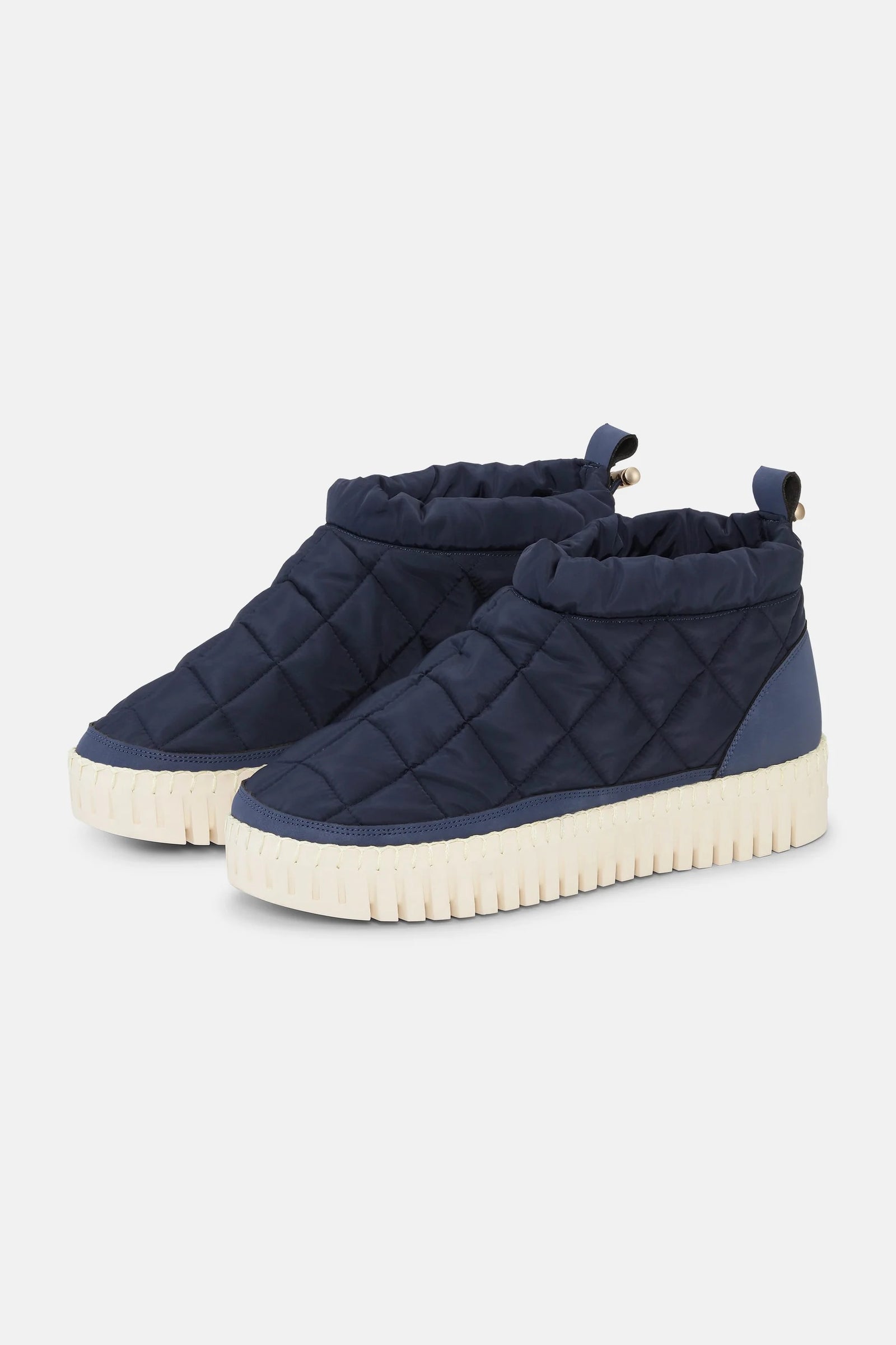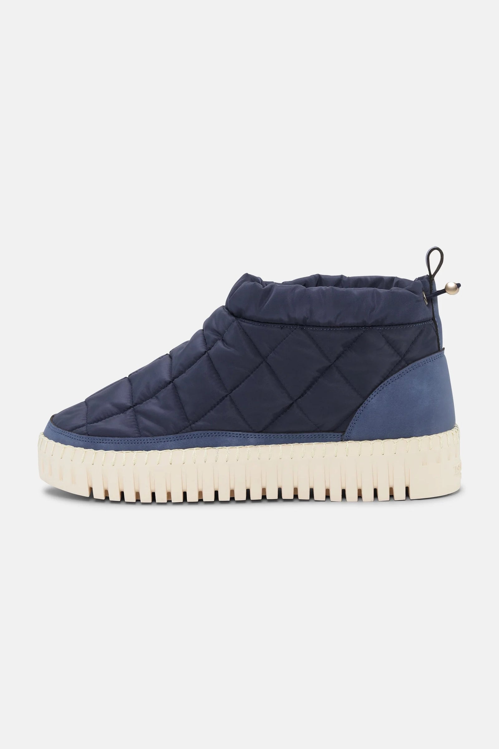 Tulip low winter boot with a quilted pattern and a water-repellent surface. Drawstring on the back for adjustments. Warm artificial down padding and microfiber lining for colder days. Resting on a waterproof outsole with match color recycled thread. The insole has padding and support to ensure great comfort.