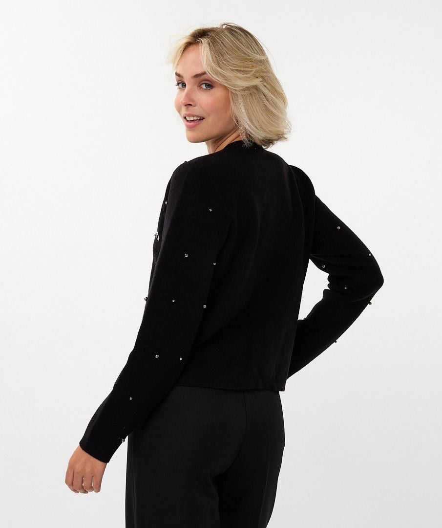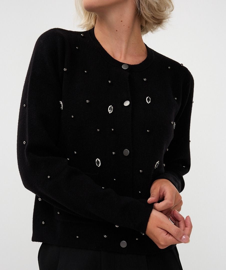 Knitted cardigan with snap buttons decorated with metallic pearl studs and rhinestones. Very pretty piece, perfect for the party season.