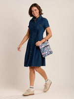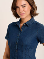 Our Antonia knee length denim dress features a flattering neat fitting waist with stitched pin tuck details to give a flattering fit, button through front, neat fitting collar neck line and short sleeves. Your new go to dress, perfect with trainers or boots.