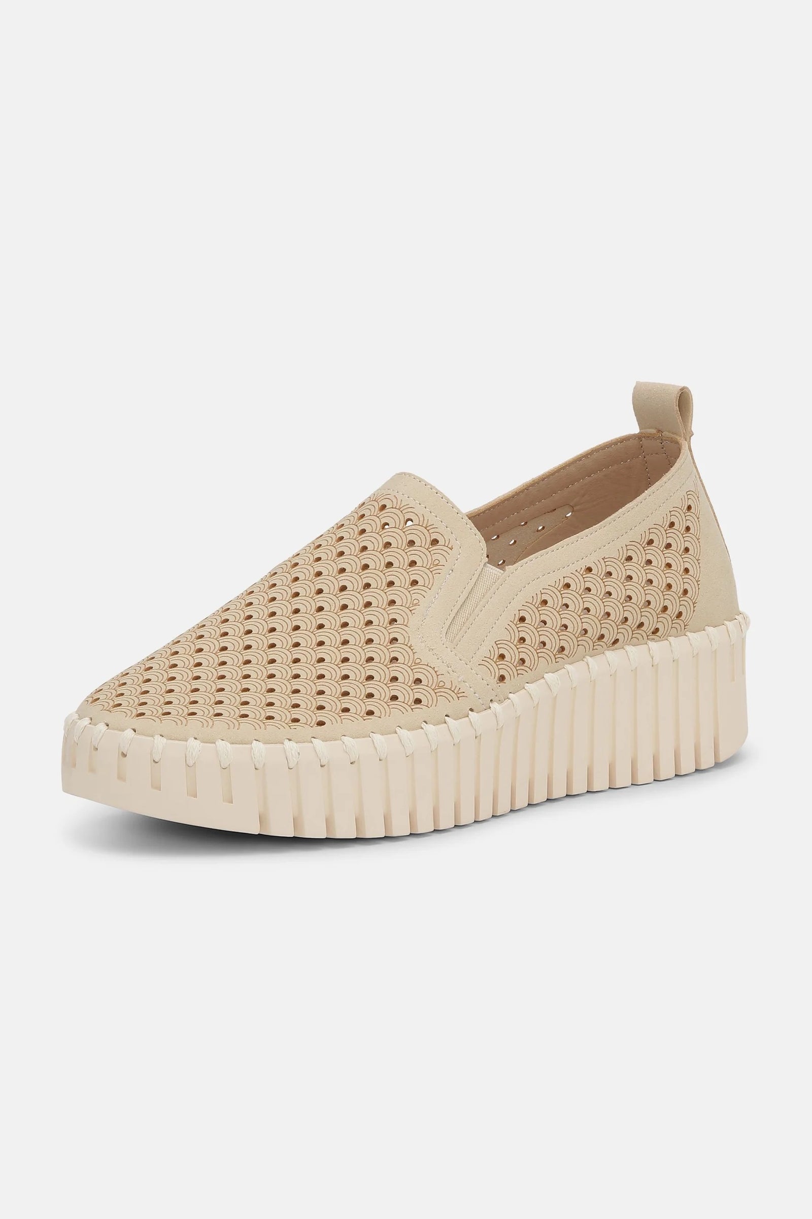 Tulip slip-on shoe on a wedge sole. The upper is made of recycled microfiber with elastics on the sides. The outsole is stitched with matching recycled thread, entirely glue-free. Inside, the soft insole provides great comfort through added padding and support.