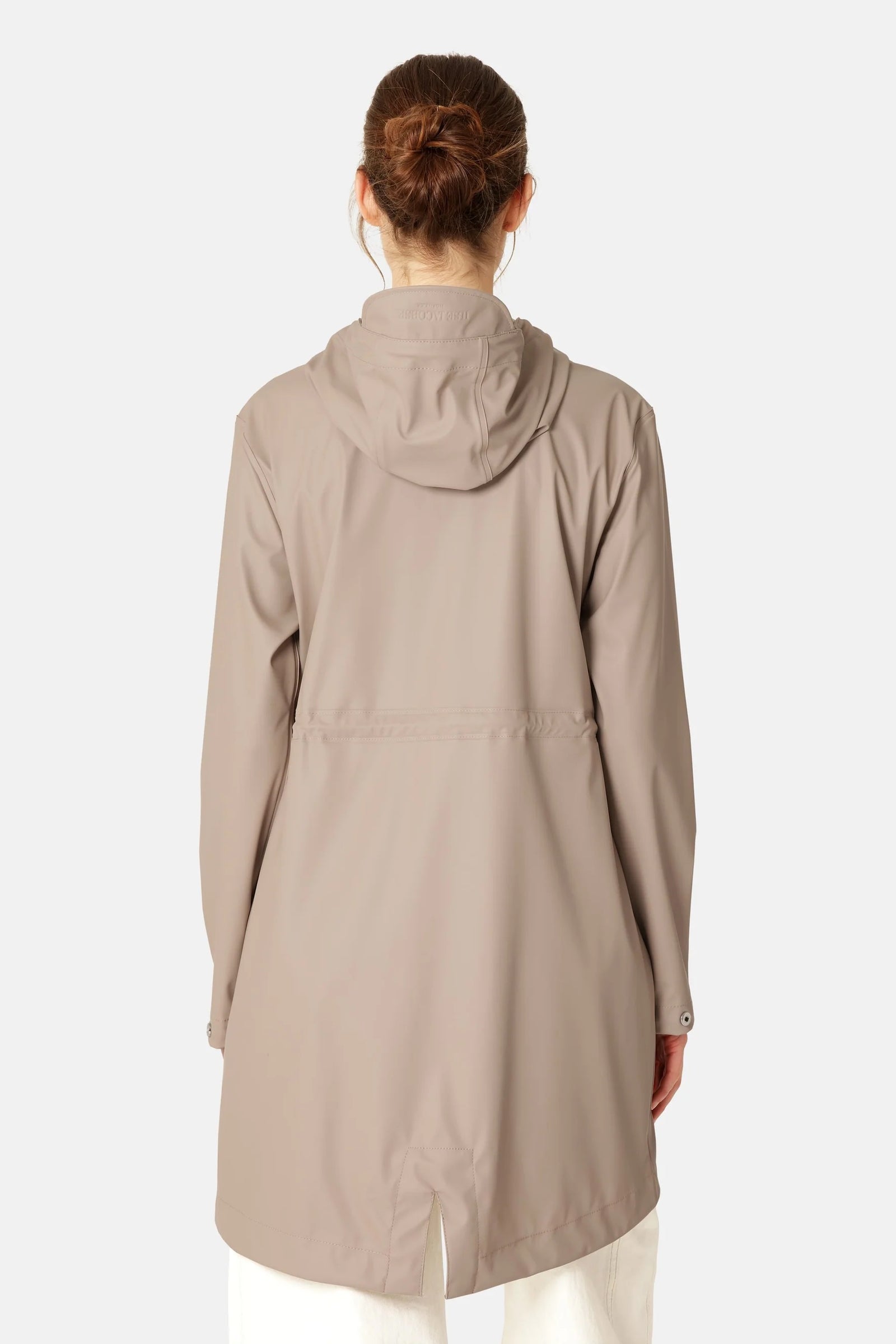 This lightweight, waterproof parka is crafted from durable rubberized PU-coated fabric with a soft tricot backing. Engineered for complete rain protection, it features welded seams and a 5,000 mm waterproof rating. The adjustable drawstring hood with a small cap shields against heavy rain, while underarm eyelets enhance breathability. Slanted front pockets provide practical storage, and the inner waist drawstring, combined with a fishtail hem, creates a flattering fit with unrestricted movement. A versatile essential for staying dry in style.