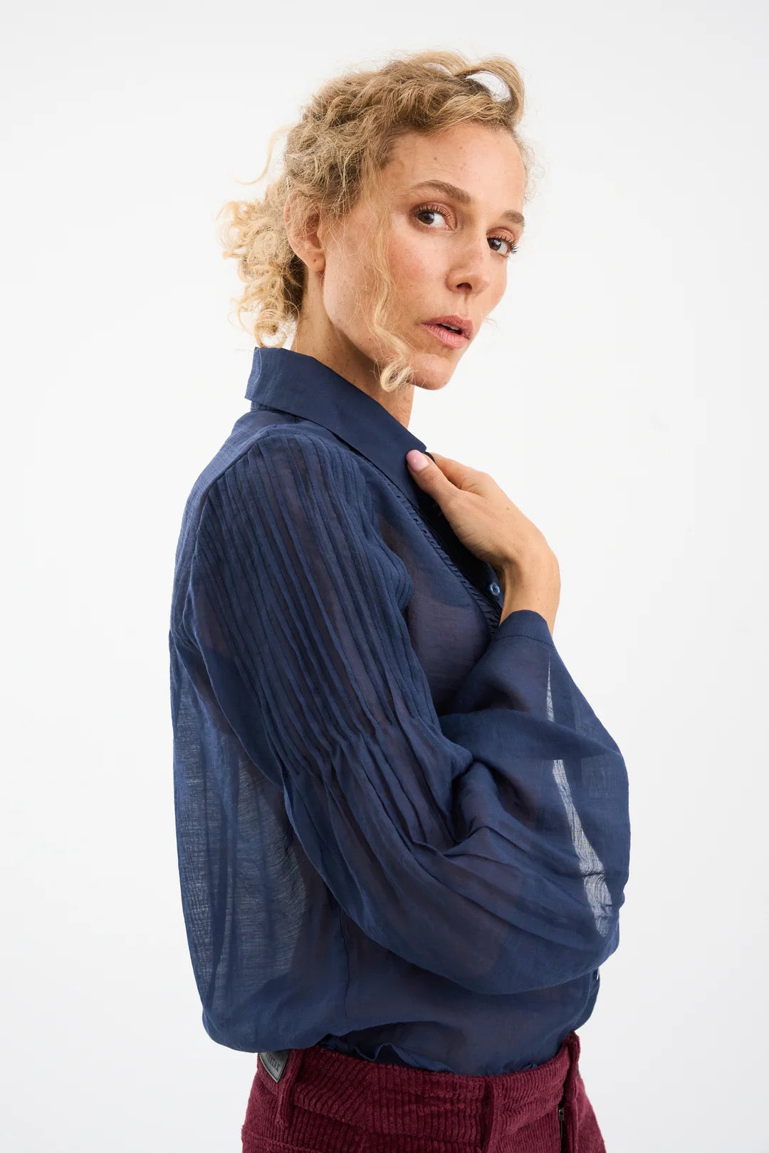Chris Pintuck Shirt is a lightweight sheer blouse designed with pintuck detailing for a refined, feminine expression. Cut from soft, slightly structured fabric, it has a loose silhouette with wide sleeves, a classic collar and a subtle pleat at the waist for gentle volume.