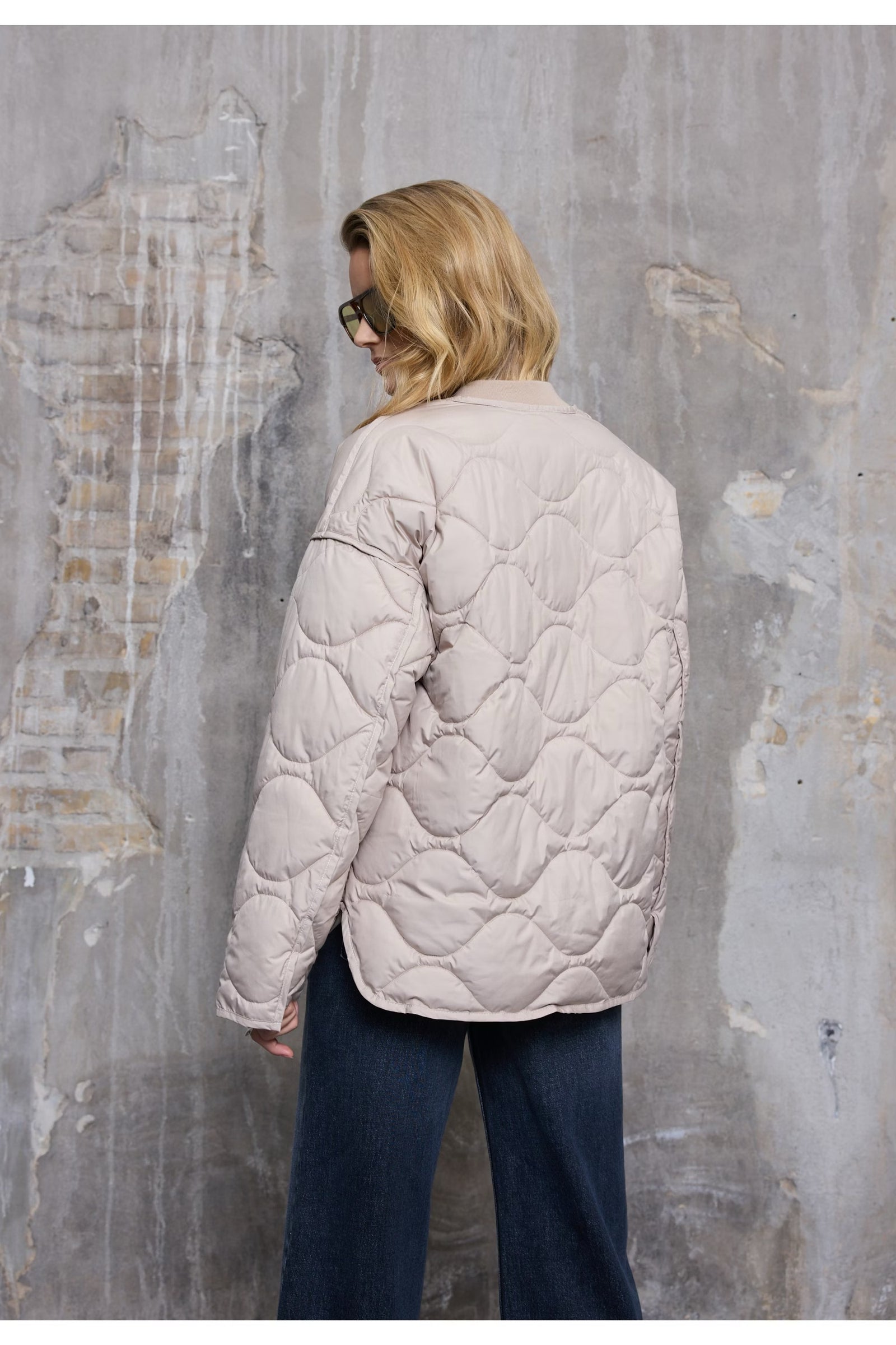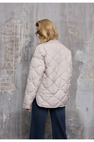 Padded jacket with a boxy silhouette and quilted texture. Features a round neckline, long sleeves, and snap front closure for a streamlined look.
