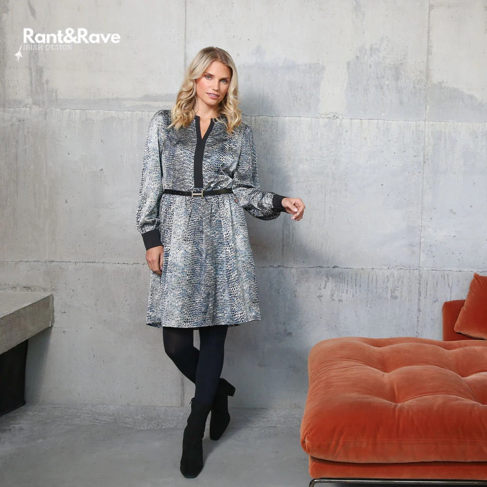 Rant & Rave Rosalynn Dress in a striking blue and black snake print. This eye-catching design combines contemporary style with a touch of wild elegance, making it perfect for both casual outings and special occasions. Crafted from high-quality materials, the dress offers a flattering fit that enhances your silhouette while ensuring comfort throughout the day. Pair it with your favorite heels or ankle boots for a chic look that turns heads wherever you go. Don't miss the chance to make a bold statement—add the Rosalynn Dress to your collection today.