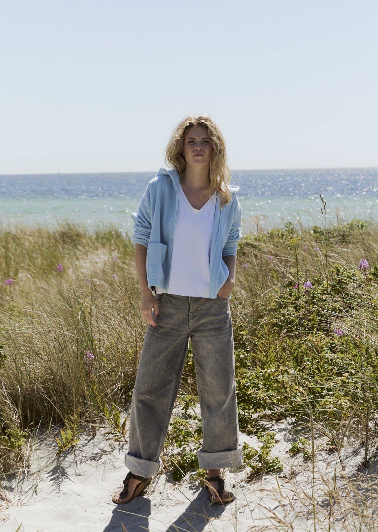 A cardigan with a more sporty look, designed with long sleeves, practical pockets, and a hood. The boxy, cropped silhouette creates a relaxed and modern feel.