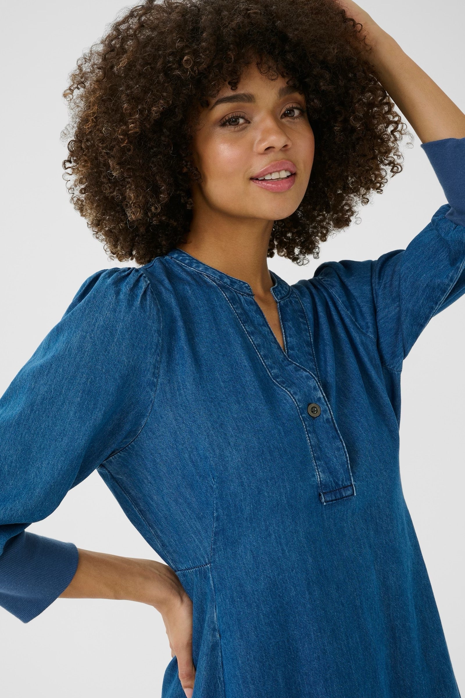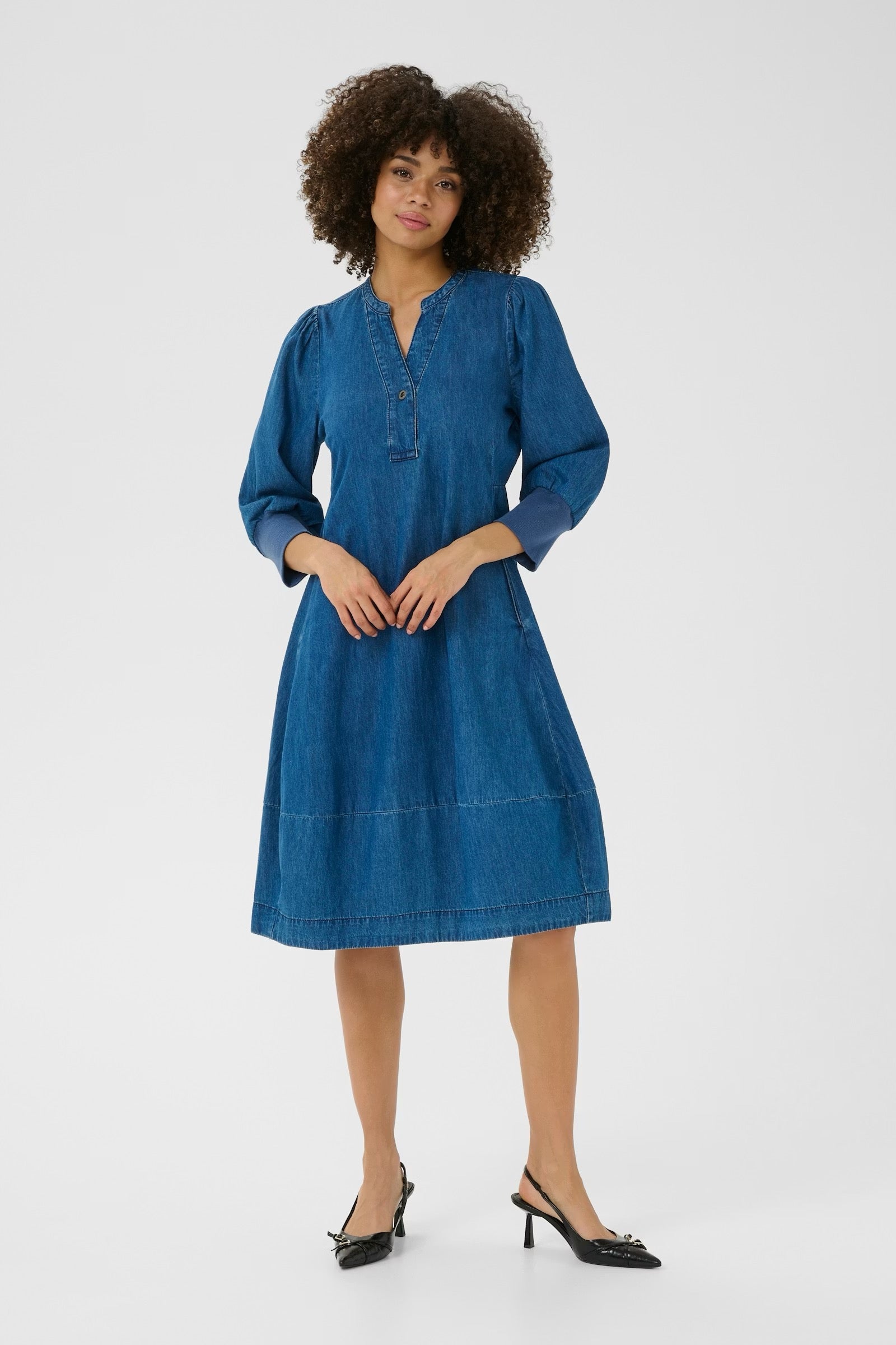 Denim dress features a straight, gently flared silhouette with a split V-neckline, partial button placket, and three-quarter sleeves with cuffed hems. Visible seams add subtle structure and detail throughout the look.
