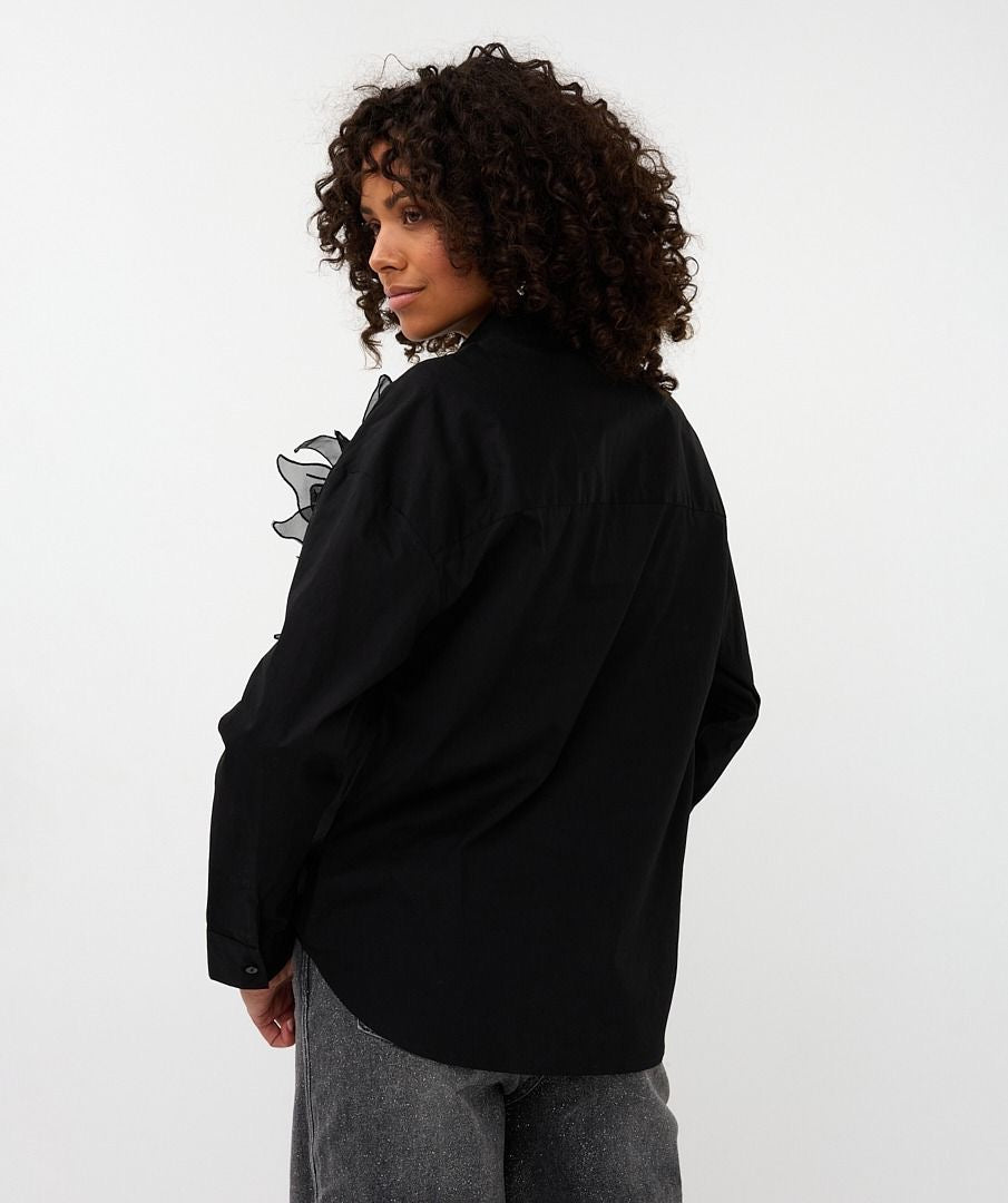 Elegant blouse with large flower on the left shoulder made from 100% cotton. Love this cool style of blouse, team it up with your favourite denims or trousers.