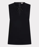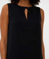 Elegant top with a split neckline held together by a beaded bow. The top fastens with a zipper at the back and is made from 71% acetate and 29% polyester.