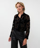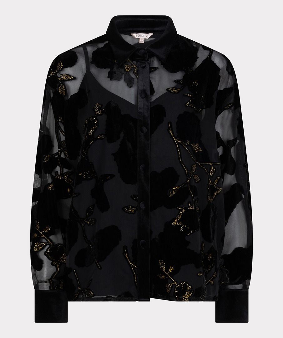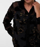 Sheer blouse with velour flowers interwoven with glittering gold lurex. The blouse comes with an undershirt and is made from 80% viscose and 20% brocade.