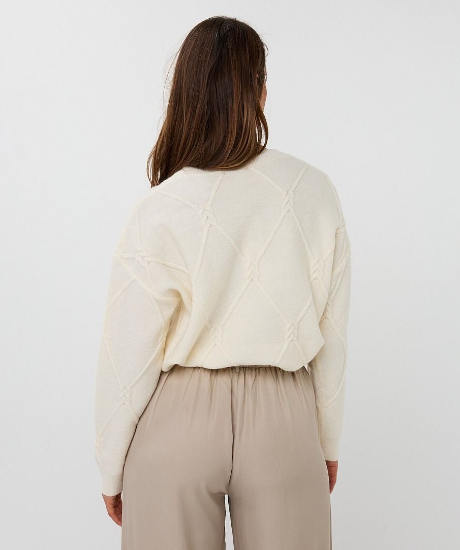 Comfortable sweater with long sleeves and round neckline. The sweater features a 3D cable design in the fabric. Model is 1.73m and wears size S.