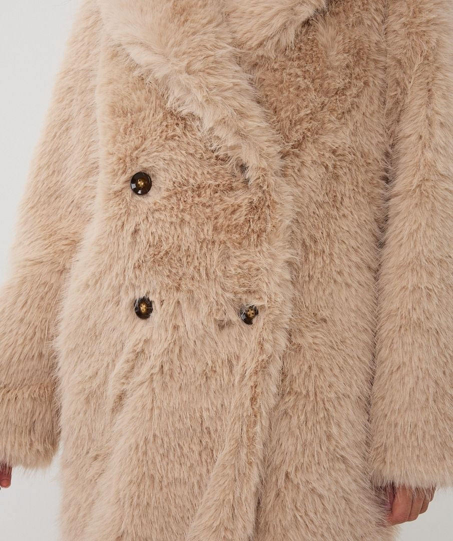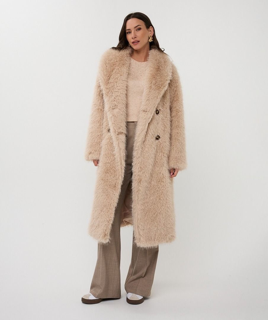 Chic long warm coat jacket made of faux bond. The coat has 4 ombre buttons and is a real must-have for every fashion-conscious woman! Model is 1.73m and wears size S.