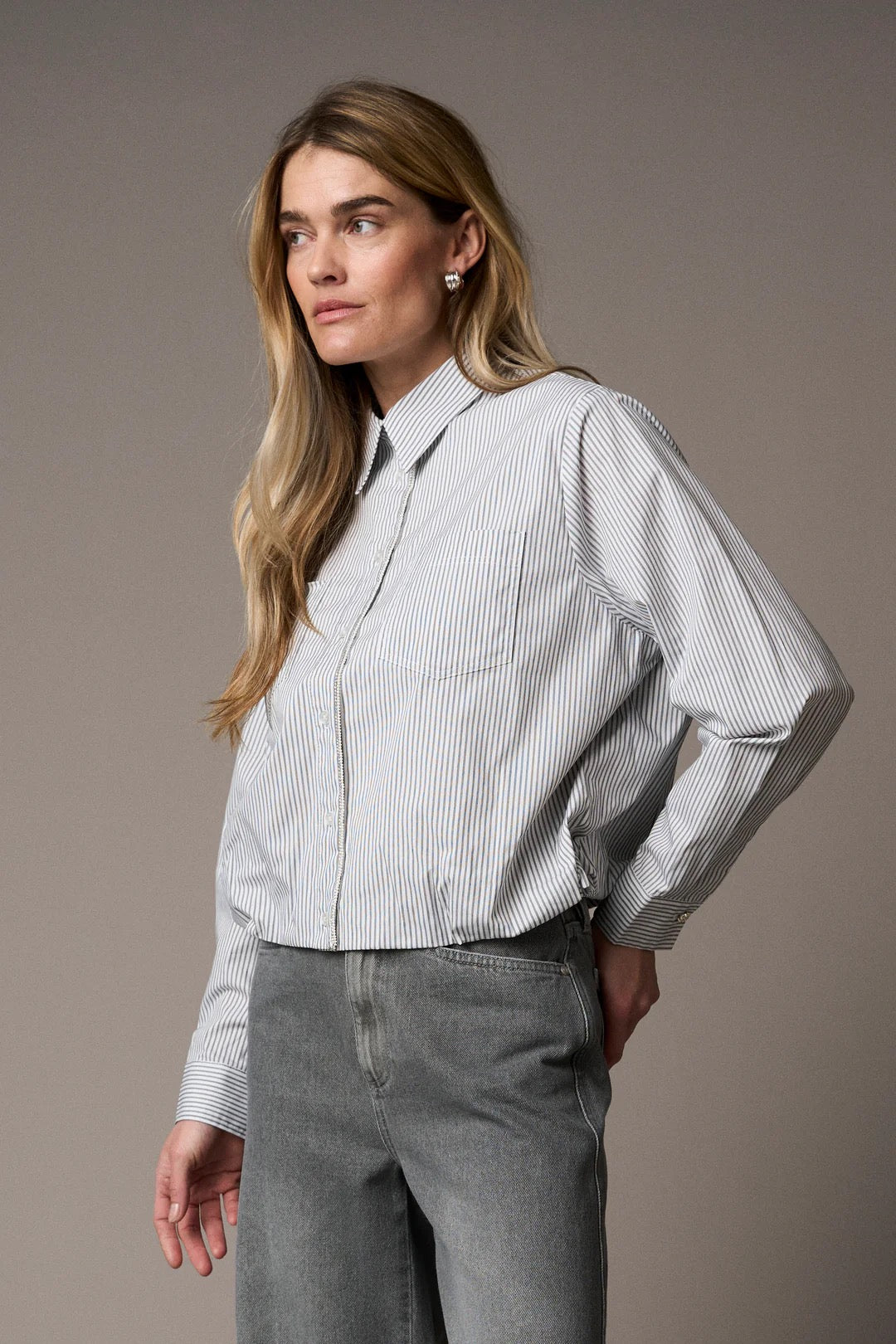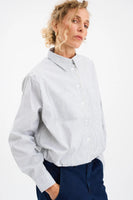 Chania Balloon Shirt is a feminine take on the classic button-down. Designed in a crisp striped cotton blend with a slightly cropped silhouette, it features a rounded balloon shape, dropped shoulders and wide buttoned cuffs.